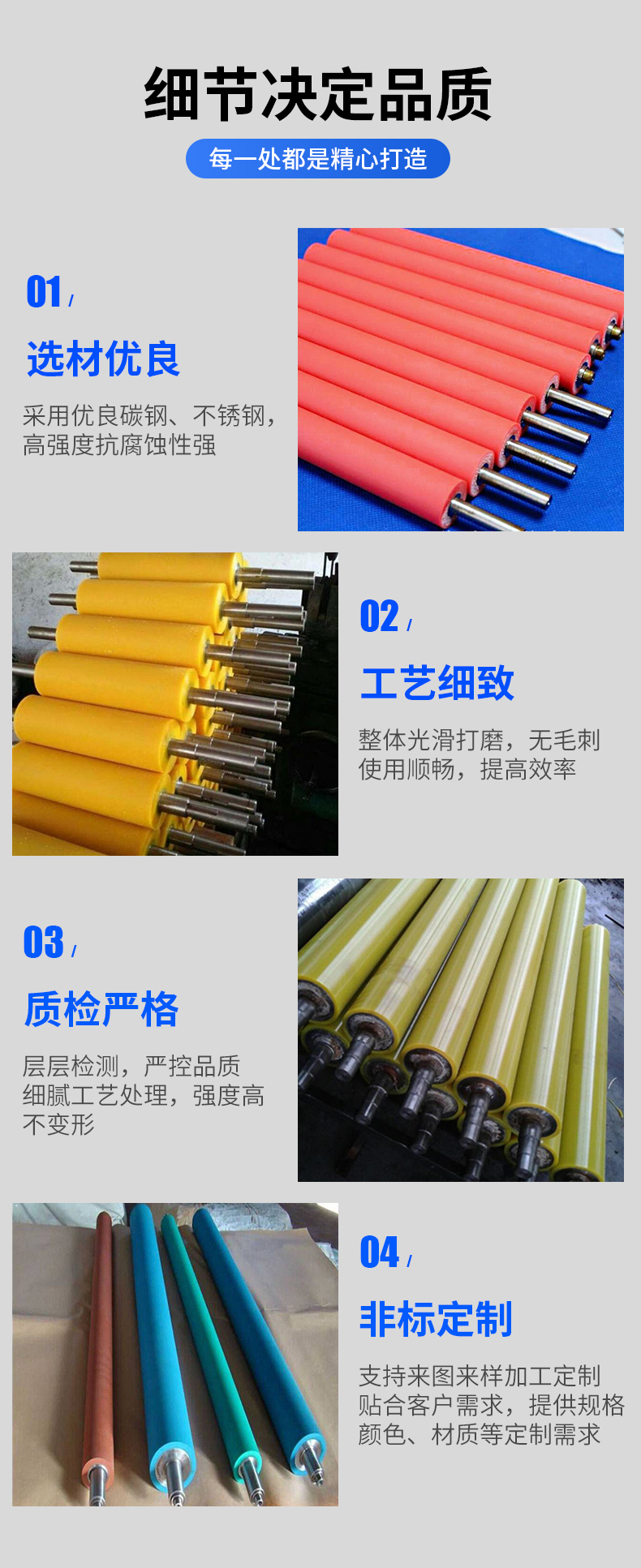 類型 包膠輥 筒直徑 Φ1米內(nèi)(mm) 壁厚 10-50mm(mm) 軸直徑 按需定制(mm) 筒長度 7米內(nèi),按需定制(mm) 筒材料 碳鋼、不銹鋼等 材質(zhì)鐵芯,丁晴膠包覆輥面 表面處理 包膠 適用范圍 應(yīng)用到印刷機械、造紙機械 丁晴膠輥具有優(yōu)良的耐油性,而且耐磨、耐老化、耐熱性能也較好,用于印刷、印染、化纖、造紙、包裝、塑料加工等設(shè)備及其它接觸油及脂肪烴類溶劑的場合。